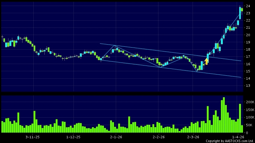 区域突破指股价在过去的一段时间只在一个范围在内活动,然後股价上升作出突破,升穿区域的顶部,技术走势向好。(港股报价延迟最少十五分钟。沽空资料截至 2026-04-08 16:25。)