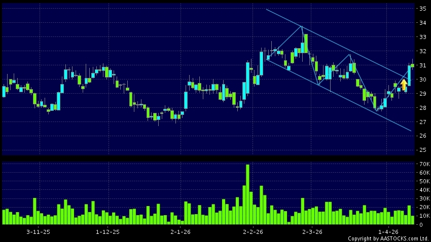 区域突破指股价在过去的一段时间只在一个范围在内活动,然後股价上升作出突破,升穿区域的顶部,技术走势向好。(港股报价延迟最少十五分钟。沽空资料截至 2026-04-16 16:25。)