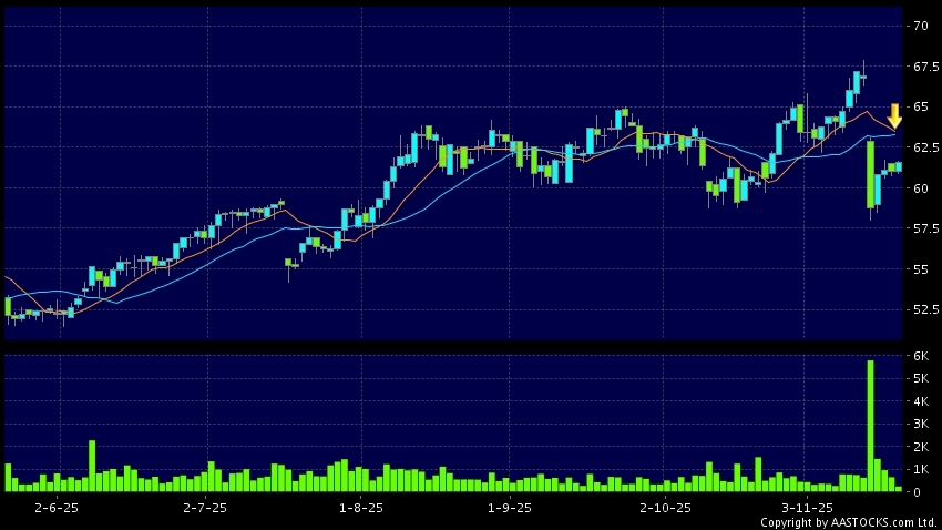 VTECH HOLDINGS(00303.HK) +1.600 (+2.606%) 沽空 $6.34百萬; 比率 13.317% 10天移動平均線跌穿20天移動平均線,出現死亡交叉。現價報61.500,上升0.737%,成交量24.28萬股,成交額1.49千萬。