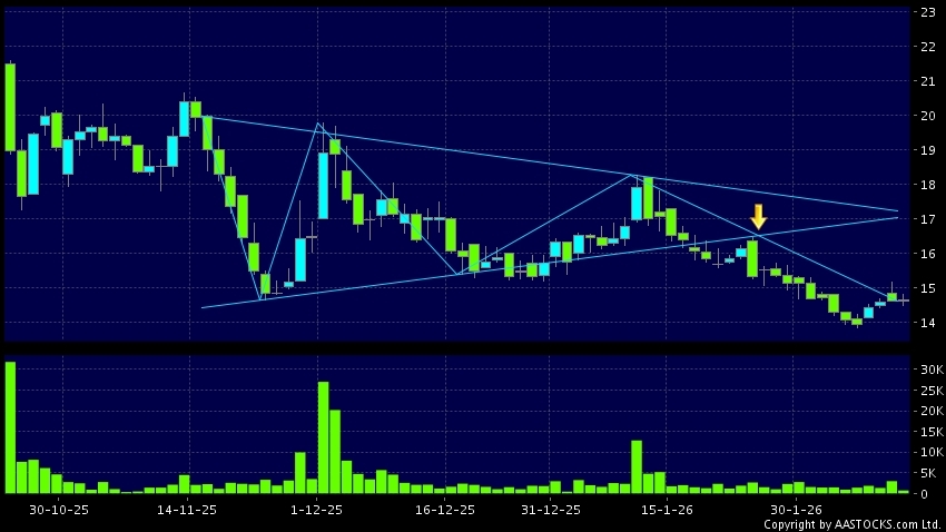 三角形向下突破是指股價的波幅漸漸收窄,在圖表上形成三角形般的狀態。股價在三角形的末端向下突破,下跌趨勢形成,技術走勢偏軟。(港股報價延遲最少十五分鐘。)