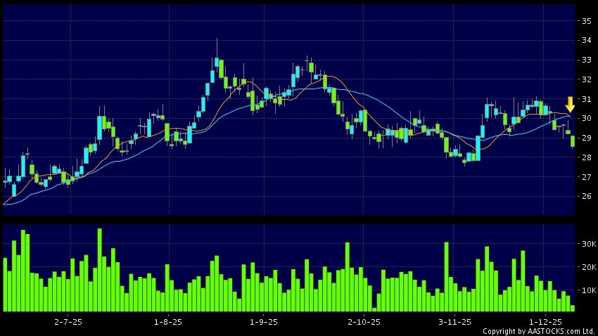 華潤置地(01109.HK) +0.100 (+0.356%) 沽空 $1.70億; 比率 33.355% 10天移動平均線跌穿20天移動平均線,出現死亡交叉。現價報28.520,下跌2.329%,成交量3.64百萬股,成交額1.05億。