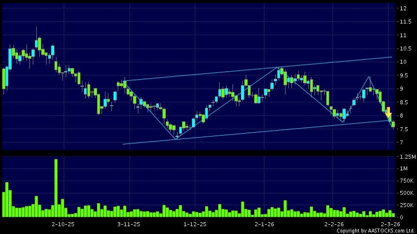 區域突破指股價在過去的一段時間只在一個範圍在內活動,然後股價下跌作出突破,跌穿區域的底部,技術走勢偏軟。(港股報價延遲最少十五分鐘。沽空資料截至 2026-03-03 16:25。)