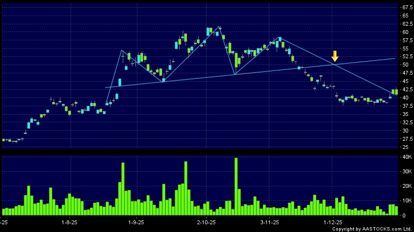 頭肩頂是典型的沽出訊號,當股價跌穿支持線(頸線)時,跌勢確認股價將持續下跌,技術走勢偏軟。(港股報價延遲最少十五分鐘。沽空資料截至 2025-12-31 12:25。)